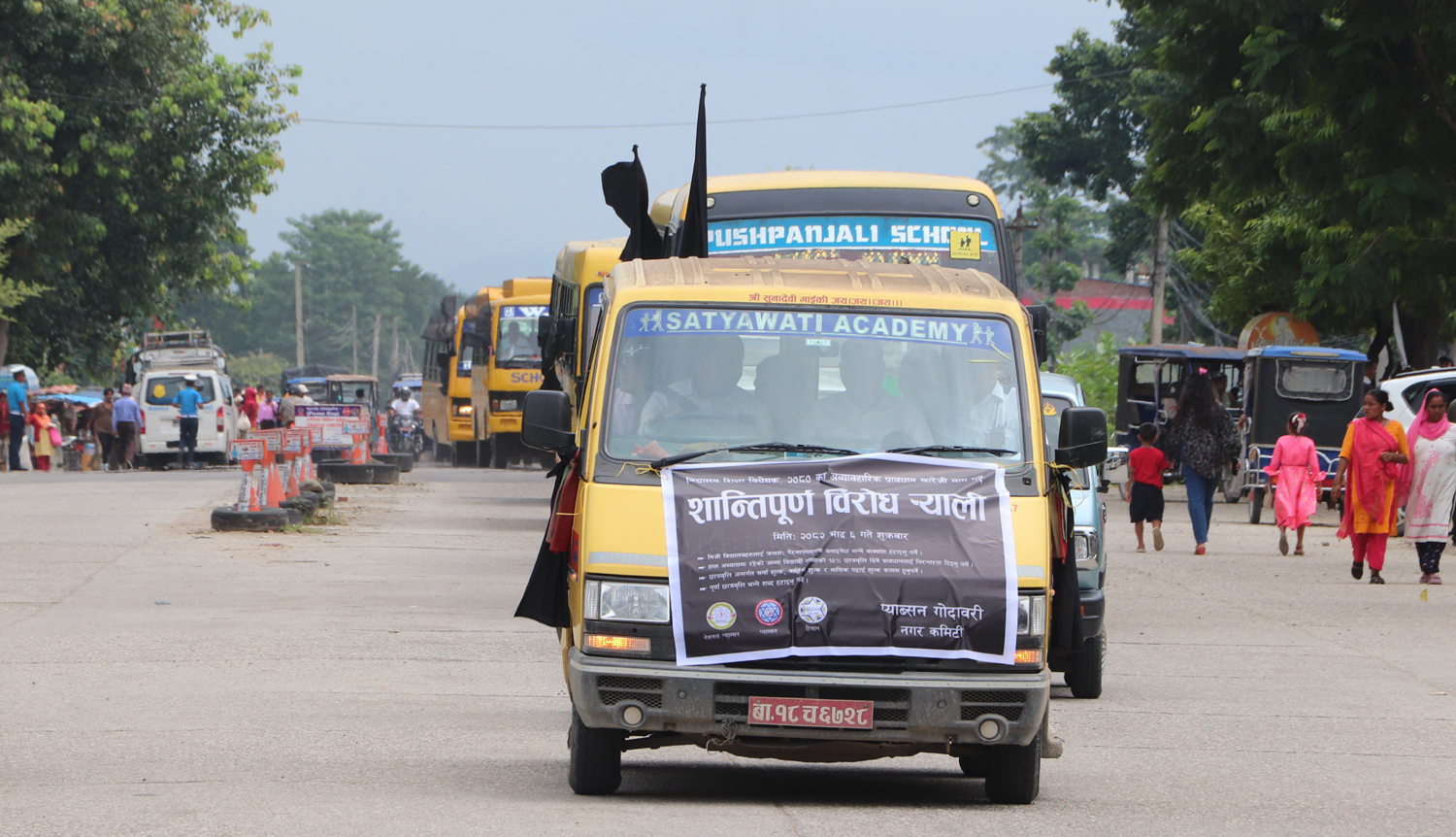 गोदावरीमा ५२ वटा स्कुल बसहरूमा कालो ब्यानर टाँसेर विद्यालय शिक्षा विधेयकको विरोध